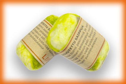 Huovutettu saippua. Huopa toimii pesimenä ja sen ansiosta vegaaninen palasaippua voidaan käyttää loppuun asti. Saippuan loputtua huopaa voi hyödyntää esimerkiks
