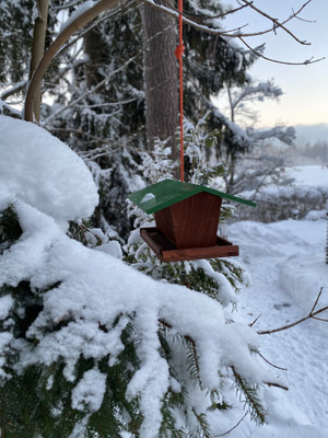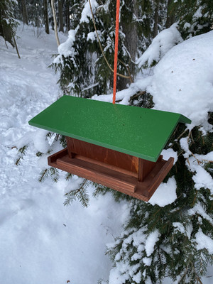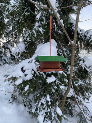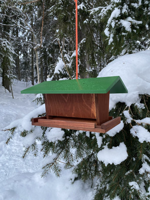 Turun vankilassa valmistettu tukeva lintulauta on varustettu avattavalla katolla ja ripustinnarulla.